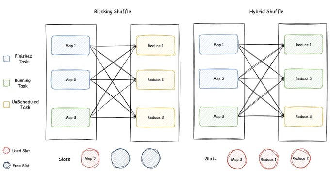- Flexible Scheduling: Hybrid Shuffle overturns the prerequisite that all tasks have to be simultaneously scheduled in Pipelined Shuffle Mode, or must be scheduled stage-by-stage in Blocking Shuffle Mode: