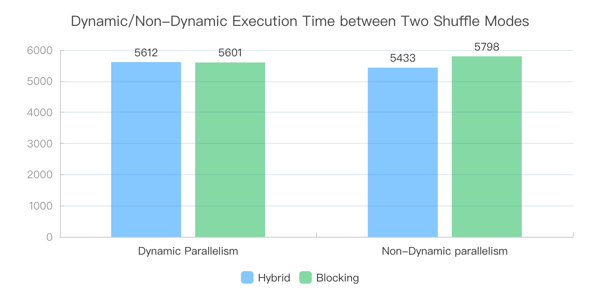 To verify the performance of the two shuffle modes under dynamic and non-dynamic parallelism modes, we tested Blocking Shuffle and Hybrid Shuffle on the TPC-DS dataset, with the default parallelism (parallelism.default) set to 1500. The experimental results are shown in the figure.